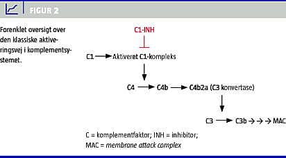 C1-INH's rolle i komplementsystemet er ligeledes interessant, idet diagnostik af HAE bl.a. beror på måling af komponenter herfra. Ved C1-INH-mangel kan også komplementsystemets reaktioner forløbe ukontrolleret (Figur 2 ). I den klassiske aktiveringsvej medfører det, at C1 kan autoaktiveres. Substratet for det aktiverede C1-kompleks er bl.a. komplementfaktor 4 (C4), der kløves og aktiveres. Dette forklarer, hvorfor man hos 95% af patienterne med HAE finder lave plasmaniveauer af C4 [10, 11].