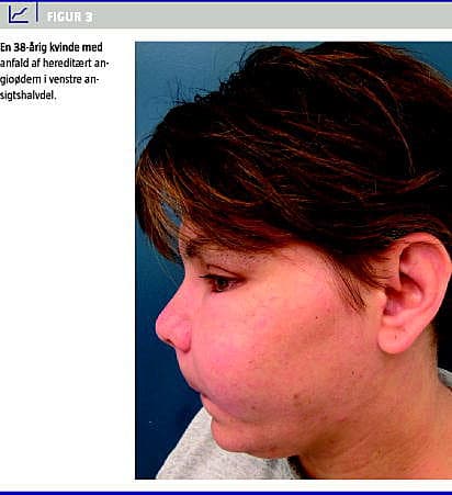 HAE er kendetegnet ved recidiverende anfald af ikkekløende, ikkeurtikarielle hævelser i hud og slimhinder (Figur 3 ). Hævelserne er typisk lokaliseret til ekstremiteter, ansigt og genitalia, men også mundhule, øsofagus og blære kan være involveret [5]. Særlig frygtet er larynxødemet, som ubehandlet har en mortalitet på op til 30% pga. asfyksi [10]. Der ses ødemer i mave-tarm-kanalens mucosa, hvilket kan give et ileuslignende billede. De abdominale manifestationer kan opstå isoleret, og i flere tilfælde er abdominale HAE-anfald blevet fejltolket som akut abdomen med nytteløs kirurgi til følge [4].