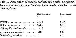 Tabel 1 viser forekomsten af bakteriel vaginose og en række mikroorganismer, der vides at kunne forårsage fluor vaginalis (7-11). Som det fremgår, er det først og fremmest bakteriel vaginose og svamp, der sammen med Chlamydia trachomatis er forbundet med fluor vaginalis. Men alle mikroorganismerne kan også findes asymptomatisk, og påvisning af en bestemt mikroorganisme er derfor ikke ensbetydende med at have påvist årsagen til generne.