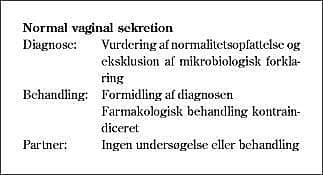 Men forklaringen kan også findes i kvindens oplevelse og tolkning af en fysiologisk normal vaginalsekretion. Det er lægens opgave at vurdere disse forhold, så de sammen med de objektive fund og mikrobiologiske undersøgelser kan danne grundlag for en rationel stillingtagen til, hvorledes den enkelte kvinde kan hjælpes bedst muligt.