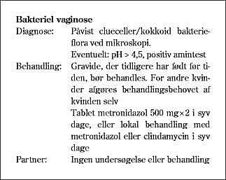 Bakteriel vaginose er en syndromdiagnose, der kræver at tre af følgende fire kriterier er opfyldt: 1) tyndt homogent vaginalsekret, 2) pH > 4,5, 3) fiskeagtig lugt ved tilsætning af 10% kaliumhydroxyd (KOH) (amintest) og 4) clueceller (vaginale epitelceller med uskarp celleafgrænsning dækket med kokkoide bakterier) påvist ved mikroskopi (24). Schmidt & Hansen har forsøgt at simplificere de diagnostiske kriterier, således at diagnosen alene baseres på mikroskopisk fund af mange kokkoide bakterier i stedet for de sædvanlige stave (25). Til daglig brug i klinikken synes dette at være acceptabelt.