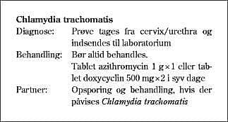 Enkeltdosisbehandling med 1 g azithromycin eller syv dages kur med tablet doxycyclin 100 mg × 2 resulterer i, at Chlamydia trachomatis er forsvundet hos ca. 95% ved vurdering 2-4 uger efter behandlingens start (37). Ved ukompliceret Chlamydia trachomatis -infektion er azithromycin at foretrække pga. øget komplians.