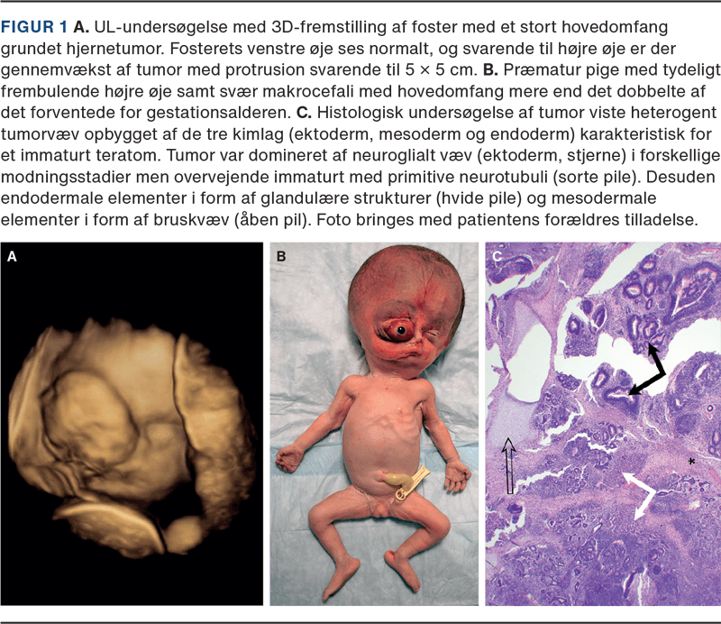 Ved obduktion fandtes en præmatur alderssvarende pige med hovedomfang over det dobbelte af det forventede for GA (Figur 1). Der var proptose af højre øje, og kraniet var massivt forstørret, rundt, blødt og spændt med udvidede suturer. Ved åbning af kraniet fandtes næsten udelukkende tumoromdannet hjernevæv med kun få gyri i venstre hemisfære. Der bekræftedes tumorgennemvækst i højre orbita og i basis cranii mod foramen magnum. Hjernevægten var seks gange det forventede for GA. Der var tegn på anæmi i form af bleghed, forstørret hjerte og hepatosplenomegali. Ved den neuropatologiske histologiske undersøgelse påvistes heterogent tumorvæv opbygget af de tre kimblade, domineret af neuroglialt væv i forskellige modningsstadier, overvejende immaturt (Figur 1). Undersøgelsen af højre øje viste tumorvæv i det omkringliggende bløddelsvæv men ikke indvækst i selve øjet. Det konkluderedes, at der var tale om et immaturt teratom uden somatisk maligne komponenter.