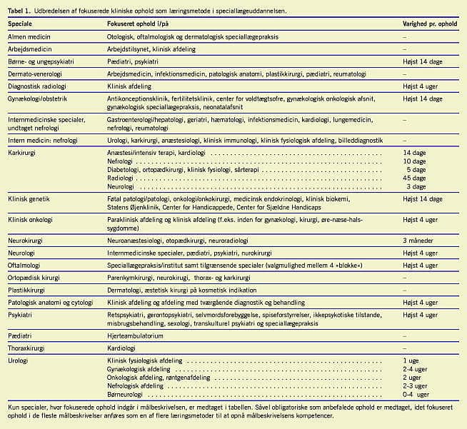 Omfanget og varigheden af fokuserede ophold som læringsmetode varierer betydeligt fra speciale til speciale, hvilket fremgår af Tabel 1. Fokuserede ophold finder primært sted som led i hoveduddannelsen. For langt de fleste specialers vedkommende er fokuserede ophold nævnt som en af flere læringsstrategier til at opnå de kompetencer, der fremgår af målbeskrivelserne. Det afhænger således af sammensætningen af de enkelte uddannelsesforløb, hvilke fokuserede ophold der konkret er nødvendige.
