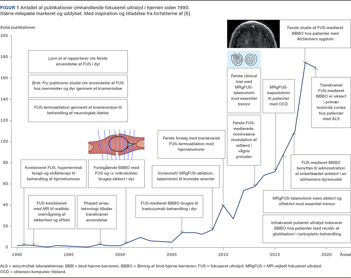Interessen for området har været tiltagende (Figur 1), og selvom anvendelsen af MRgFUS ud over indikationen bevægeforstyrrelser fortsat er eksperimentel, er FUS bl.a. undersøgt til behandling af Alzheimer-demens, kroniske smerter, depression og ALS samt til neuroonkologien, som vil være det primære fokus for denne artikel.
