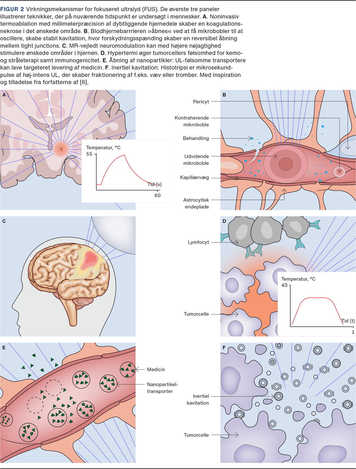 Fokuseret ultralyd (FUS) er en eksperimentel teknik, hvor man vha. en buet transducer, en linse eller et faseopdelt array fokuserer UL-bølger mod et mindre område uden at påvirke omkringliggende væv [1]. Teknikken har været kendt siden 1940’erne og bruges som behandling af bl.a. uterusfibromer og prostatacancer [2, 3]. I begge tilfælde er teknologien velundersøgt i større studier og benyttes klinisk uden for Danmarks grænser. Artiklen her har til formål at oplyse om den allernyeste eksperimentelle udvikling.