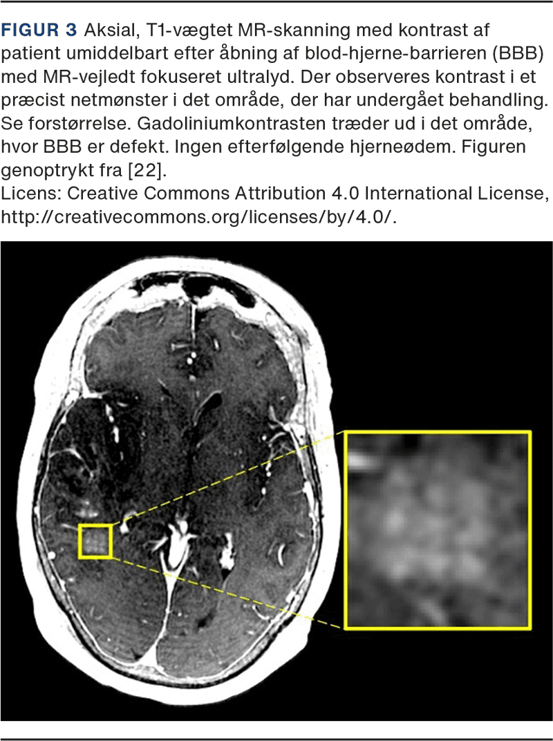Integriteten af BBB har vist sig at genetableres inden for 6-24 timer. Der er dermed tid til, at de ønskede kemoterapeutika kan nå at passere BBB. Med FUS BBBO har man været i stand til at få dekstranmolekyler (2.000 kDa) til at passere BBB [20], ligesom det har været muligt at skabe transport af forskellige kemoterapeutika, virale vektorer og stam- og immunceller [21]. Selve åbningen af BBB kan valideres med MR med kontrast (Figur 3).