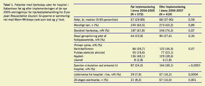 I de to perioder havde 17.576 patienter kontakt til Akutlægebilen. Ud af 528 hjertestop uden for hospital før implementering og 566 efter implementering blev henholdsvis 372 og 419 forsøgt genoplivet. Vi fandt, at 30-dages overlevelsen steg signifikant efter implementeringsperioden (8,3% versus 16,0%, p = 0,001) (Tabel 1 ). ROSC ved ankomst til hospital sås hos en signifikant større andel af patienterne efter implementeringen, 24,0% vs. 39,1% (Tabel 1). Andelen af patienter med ROSC, som overlevede 30 dage, ændrede sig ikke signifikant efter implementeringsperioden; 31/87 = 36% vs. 67/164 = 41%. Udskrivelse fra hospital i live sås hos 29 (7,9%) patienter før og 67 (16,3%) patienter, efter at de nye retningslinjer blev indført. Vi fandt ikke nogen forskel i de to perioder med hensyn til alder, køn, responstid, primærrytme, formodet ætiologi eller basal genoplivning ved forbipasserende (Tabel 1). Efter implementeringen blev mekanisk brystkompression brugt til 77 patienter, af hvilke 40 (52,0%) havde ROSC ved ankomst til hospital mod 124/342 (36,3%) af de øvrige patienter (p = 0,01), men 30-dages overlevelsen var ikke signifikant forskellig 10/77 = 13,0% mod 57/342 = 16,7%, p = 0,43. Den multivariate analyse bekræftede, at perioden efter implementeringen var en uafhængig prædiktor for forbedret 30-dages overlevelse, oddsratio (95% KI): 2,5 (1,4-4,6; p = 0,002). Derudover var der bedre 30-dages overlevelse hos mænd og hos patienter med bevidnet hjertestop, primær rytme lig med ventrikelflimren, alder under 70 år, og hvis forbipasserende havde ydet basal genoplivning. Brugen af apparatet til mekanisk brystkompression var associeret med forringet 30-dages overlevelse, oddsratio: 0,4 (0,2-1,0; p = 0,04).