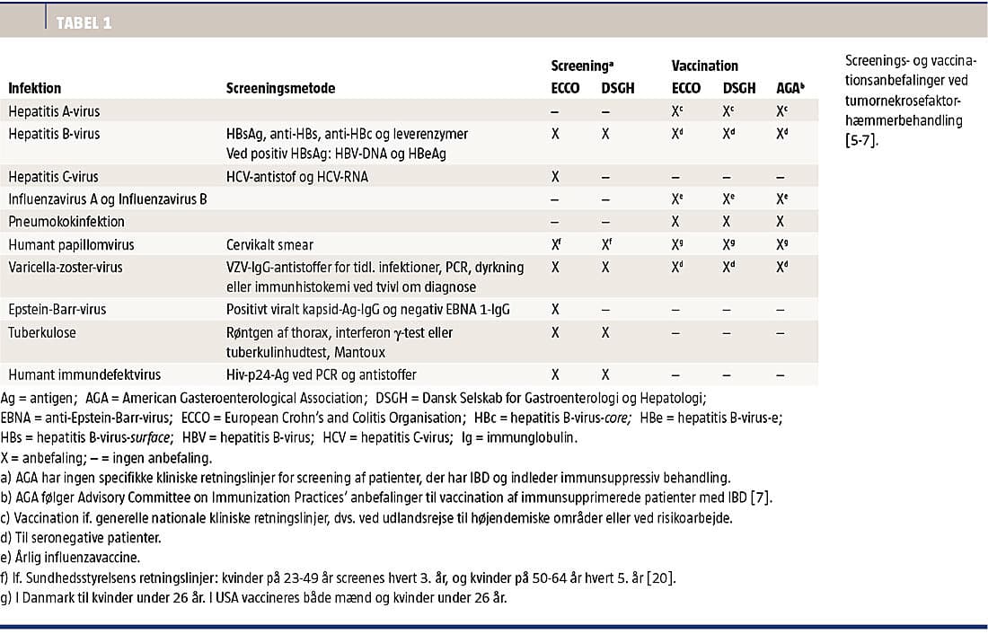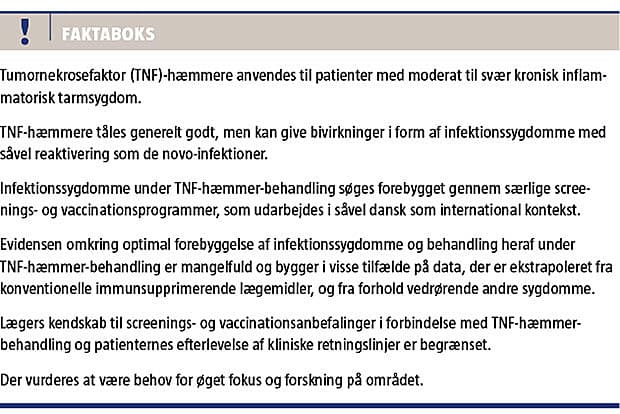 løb ofte med stor indflydelse på det enkelte individs livskvalitet [1]. Patienter, der har aktiv IBD trods behandling med konventionelle immunmodulerende lægemidler, behandles med tumornekrosefaktor (TNF)-hæmmere, dvs. monoklonale antistoffer mod det proinflammatoriske cytokin TNF-alfa, i form af infliximab, adalimumab eller golimumab (certolizumab pegol anvendes i visse tilfælde off label) [2]. TNF-hæmmere tåles generelt godt. En af de hyppigste bivirkninger, ud over infusions- og injektionsreaktioner, er forskellige typer af infektionssygdomme, som kan opstå eller reaktiveres på grund af TNF-hæmmernes generelle immundæmpende virkning [3]. Infektionerne kan være alvorlige og i visse tilfælde fatale. Dette er baggrunden for, at man i nationale og internationale kliniske retningslinjer anbefaler screening for latente infektionssygdomme forud for behandling med TNF-hæmmer, og at der i tilfælde af positive resultater af screeningsundersøgelser gives relevant behandling inden TNF-hæmmerbehandlingen igangsættes. Herudover anbefales forebyggende vaccinationer både inden behandlingen og løbende under TNF-hæmmerbehandlingen [4-6]. Sammenlignelige forhold er principielt gældende inden for andre sygdomme, hvor TNF-hæmmere anvendes, f.eks. reumatoid artritis og psoriasis.