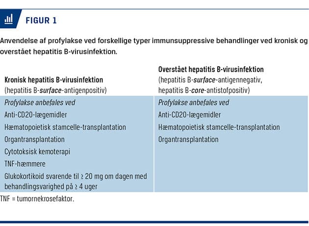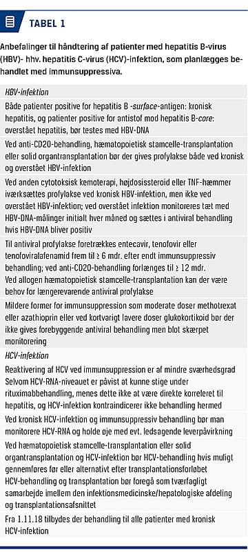 Vi har i denne artikel opsummeret risikoen for reaktivering ved kronisk og overstået HBV-infektion samt håndteringen af HCV-infektion ved forskellige immunsuppressive behandlinger.