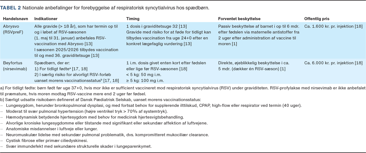 Efter seks årtiers kendskab til RSV er der nu udviklet en effektiv og sikker maternel vaccine til beskyttelse af deres spædbørn. I Danmark har Indenrigs- og Sundhedsministeriet bekendtgjort, at Abrysvo (RSVpreF, Pfizer) fra 1. oktober 2025 er inkluderet i vaccinationsprogrammet til gravide i forbindelse med et allerede planlagt lægebesøg i 32. graviditetsuge i perioden maj til januar måned (termin juli-marts). I sæsonen 2025/2026 tilbydes vaccination til og med 36. graviditetsuge [13] (Tabel 1 og Tabel 2).
