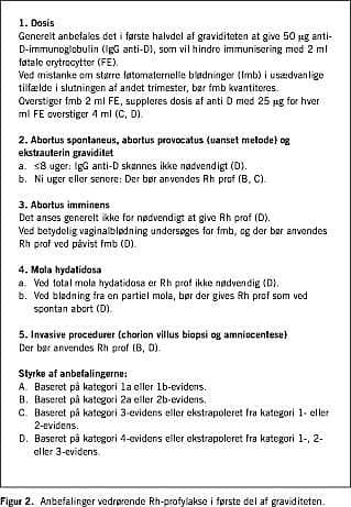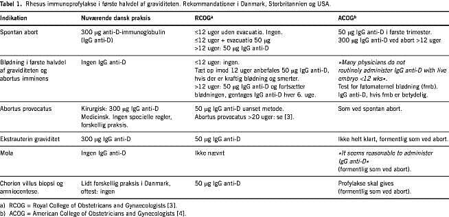 Nogle af de kliniske situationer, der tænkes på i pkt. 3, er: ekstrauterin graviditet, amniocentese, chorion villus biopsi, udvendig vending af fosteret og den fmb, som uden kliniske tegn, forekommer i en betydelig del af graviditeterne især i sidste trimester. Med hensyn til disse indikationer er praksis blevet udviklet lidt forskelligt her i landet, og den adskiller sig på flere punkter fra de principper, man anvender i andre lande, f.eks. i Storbritannien og USA. (Tabel 1 og Tabel 1 i [5]). Med henblik på opdatering af anbefalingerne er der foretaget en kritisk gennemgang af de publikationer om emnet, der blev fundet via MEDLINE og gennem forskellige oversigtsartikler. Denne artikel omhandler nogle basale forhold og problemerne i første halvdel af graviditeten, mens en anden oversigtsartikel [5] omhandler sidste halvdel af graviditeten og fødslen.