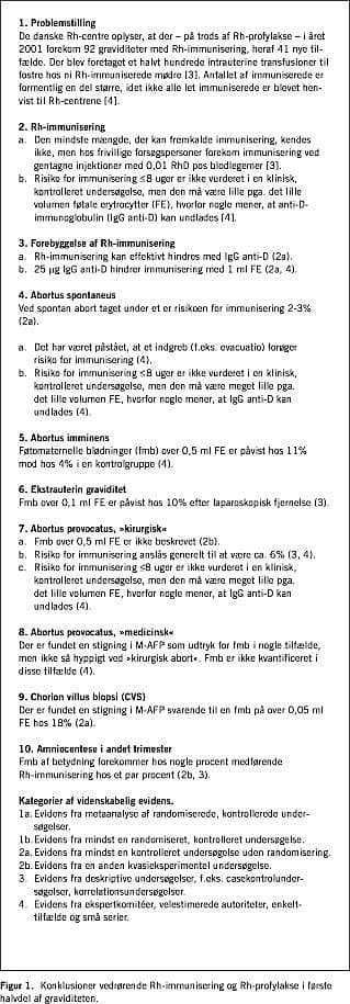 Profylakse imod immunisering af Rhesus negative (RhD neg) gravide med dannelse af Rhesus antistoffet anti-D (anti-D) blev indført i Danmark i slutningen af 1969, idet anti-D immunoglobulin (IgG anti-D) skulle gives til alle RhD neg kvinder, som havde født et RhD pos barn eller havde haft en abort, hvis de ikke allerede havde dannet anti-D [1]. Indførelsen af Rhesusimmunoprofylaksen (Rh prof) medførte - ligesom i resten af verden - et stort fald i hyppigheden af hæmolytisk sygdom hos nyfødte (erythroblastosis foetalis). Rh prof har nu været anvendt i Danmark i mere end 30 år, og der kan derfor være grund til at revurdere de givne anbefalinger.