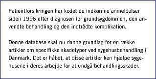 Summary Einar Krag, Ole Hart Hansen, Steen Mejdahl, Jens Krogh Christoffersen, Martin Erichsen & Arne Grünfeld: Prevention of treatment injuries in hospital: summary of the Danish Patient Insurance Association's case records Ugeskr Læger 2004;166: 1755-1757 The law of 1992 on patient insurance applies to all patients who have suffered a treatment injury in a Danish hospital. In 2002, the number of claims increased to 3,600. They are assessed by a panel of experienced medical specialists working closely with a legal office. The no-fault principle is applied, and no reports on the persons responsible for the injuries are made to the authorities. Since 1996 the claims have been registered according to diagnosis, treatment and complications. This archive presently includes 18,000 claims, and we are now going to publish the results regarding specific injuries. The first three papers are in press. It is our hope that the papers will be used by hospitals in their work toward quality improvement.