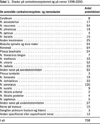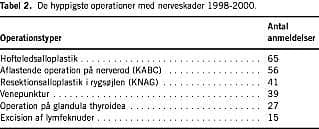 I øjeblikket er der foretaget registrering af ca. 18.000 skader anmeldt i årene 1996-2003. PF's registreringer gør det f.eks. muligt at lave en nærmere undersøgelse af samtlige anmeldte nerveskader. Blandt 8.002 sager anmeldt i 1998-2000 er der således 708 patienter, der har anmeldt en skade på centralnervesystemet eller perifere nerver (Tabel 1 ). De kirurgiske indgreb, der hyppigst var årsag til nerveskader, fremgår af Tabel 2 .