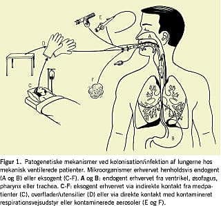 Kolonisation af ventrikel, øsofagus, pharynx og trachea (det aerodigestive område) samt mikroaspiration er de vigtigste patogenetiske mekanismer ved VAP, der er forårsaget af endogent erhvervede mikroorganismer (Figur 1 ). Sekret kan sive ned langs tubens sider, og patientens naturlige hostereflekser er oftest insufficiente på grund af anvendelse af sedation og relaksation. Endelig kan patientens grundsygdom, eventuel immunsuppressiv behandling samt langt og tungt sengeleje ved respiratorbehandling være risikofaktorer for VAP.