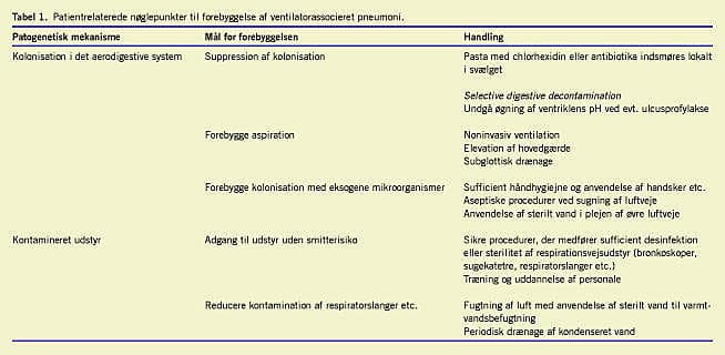 Summary Prevention of ventilator associated pneumonia in an intensive care unit Ugeskr Læger 2007;169(49):4268-4271 Important pathogenic mechanisms in ventilator associated pneumonia (VAP) are pharyngeal colonization, micro-aspiration, and exogenously acquired pathogens. Semirecumbent positioning, subglottic suctioning, non-invasive ventilation, oropharyngeal application of chlorhexidine or antibiotics, and selective digestive decontamination (SDD) have all been shown to lower the incidence of VAP. However, regular use of SDD is not recommended in recent guidelines due to the risk of antimicrobial resistance. High hygienic standards and routine surveillance of VAP incidence are mandatory.