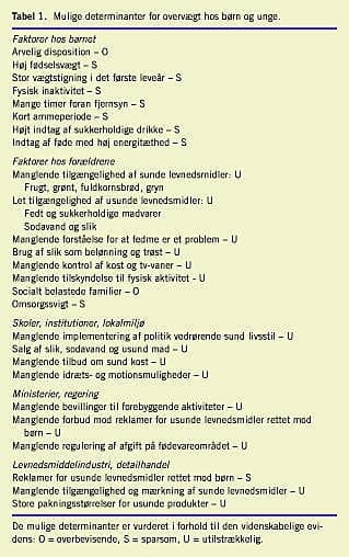 Der er foreslået en lang række årsager til den stigende forekomst af overvægt og fedme hos børn. Tabel 1 giver en oversigt over de vigtigste faktorer opdelt på forskellige niveauer. Evidensen for en kausal sammenhæng varierer meget for de forskellige faktorer, og der er specielt kun sparsom evidens for, at intervention over for disse faktorer har en forebyggende effekt. Det sidste skyldes bl.a. de relativt få interventioner, der er udført på området [3]. Der er dog enighed om, at fedmeepidemien og dens konsekvenser, specielt for børn og unge, er så alvorlige, at der bør handles nu, samtidig med at initiativerne bliver nøje evalueret med henblik på at opnå erfaringer til løbende at bedre indsatsen. I Danmark har Ernæringsrådet gennemgået den videnskabelige evidens for forebyggelse af fedme [1], og Sundhedsstyrelsen har udgivet en handlingsplan med konkrete forslag til forebyggende initiativer, der dog kun er delvist implementeret [4]. I andre lande, bl.a. England [5], har man udfærdiget lignende planer. I disse rapporter slås det fast, at det er nødvendigt at gennemføre en bred vifte af interventioner, der involverer mange aktører og institutioner, for at man skal kunne gøre sig håb om at knække kurven [1, 4]. Der er mange gode grunde til, at forebyggelsen primært bør rettes mod børn og unge (Tabel 2 ). Forebyggelsesstrategien skal både indeholde elementer, der er rettet mod hele befolkningen (populationsstrategi), og elementer, der er rettet mod grupper, der har høj risiko for at få overvægt (højrisikostrategi).