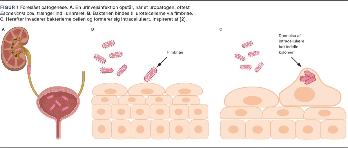 Recidiverende urinvejsinfektion (rUVI) defineret som mindst to episoder inden for seks måneder eller mindst tre episoder på 12 måneder er en hyppig klinisk problemstilling, der især rammer yngre kvinder i den seksuelt aktive alder og kvinder over 65 år [1]. Meget af den nuværende viden om patogenesen stammer fra musemodeller [2], som har vist, at uropatogene bakterier som Escherichia coli, Klebsiella pneumoniae, Enterococcus faecalis og Proteus mirabilis [3] kan adhærere til urotelceller via fimbriae, hvilket muliggør invasion og infektion (Figur 1) [2, 4]. Nyere forskning tyder desuden på, at intracellulære bakteriereservoirer i urotelet, biofilmdannelse samt forstyrrelser i mikrobiomets sammensætning i tarm, vagina og urinblære kan bidrage til rUVI, og særligt formodes en lavere andel af Lactobacillus-species i blærens mikrobiom at øge denne risiko [2].