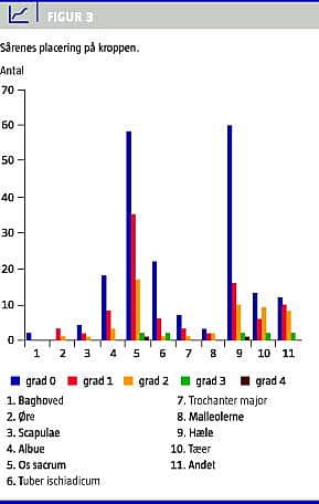 I alt blev der observeret 196 grad 0-, 92 grad 1-, 54 grad 2-, 12 grad 3- og 2 grad 4- tryksår. Hos 46 patienter blev der observeret to, hos 34 fandtes tre, hos 15 fandtes fire og hos en enkelt patient hele fem tryksår.
