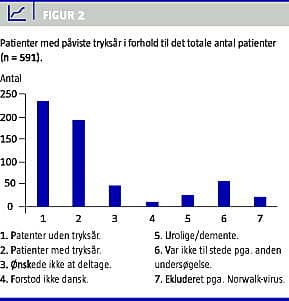 Resultater: I undersøgelsesperioden var der indlagt 591 patienter på de afdelinger, som var inkluderet. I alt 164 patienter blev ekskluderet, og 427 patienter blev undersøgt af projektgruppen. Der blev fundet en prævalens på 32,5%. Når tryksporene ikke blev regnet med, var prævalensen på 17,3%.