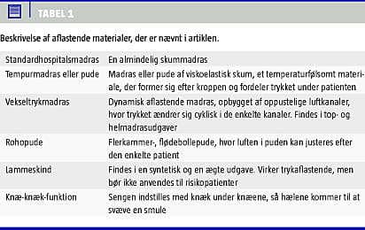 Af de 39 patienter med grad 2-tryksår som værste sår lå de 21 på en standardhospitalsmadras. De øvrige 18 patienter lå på enten en tempurmadras eller en vekseltryk-, top- eller helmadras. I den siddende stilling var otte patienter aflastet med enten tempur eller rohopude. En patient sad på et lammeskind og en patient på en almindelig hovedpude. De resterende var ikke aflastet i den siddende stilling. I alt 32 patienter havde ingen aflastning til hælene.