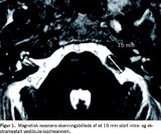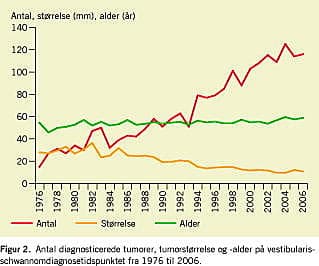 I Danmark blev der i 1976 diagnosticeret 15 VS, hvilket svarer til 2,9 tumorer pr. mio. [13, 14], dette antal er steget gennem årene [15] til 116 i 2006, svarende til 22,3 tumorer pr. mio. En tilsvarende stigning er også rapporteret fra andre centre i verden [16, 17]. I 2000 gennemgik Anderson et al [18] 24.246 MR-skanninger fra patienter uden audiologiske gener. I 17 tilfælde, svarende til 700 pr. mio., fandtes uventet VS. I et senere arbejde fra 2005 [19 ] fandt man ved 46.414 MR-skanninger, otte patienter med VS, hvilket svarer til en incidens på 172 tumorer pr. mio.