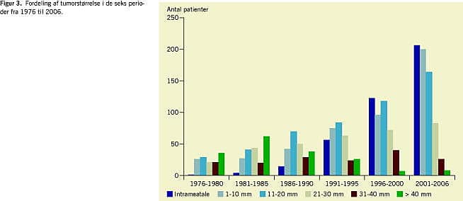 Gennem perioden er der sket et stort fald i tumorstørrelse på diagnosetidspunktet, fra en gennemsnitlig ekstrameatal størrelse på 35 mm i begyndelsen af perioden til 10 mm i slutningen af perioden (Figur 2). I de første år blev der stort set ikke diagnosticeret intrameatale tumorer, men i slutningen af perioden var andelen af intrameatale tumorer steget til 35%. I begyndelsen af perioden udgjorde de meget store tumorer næsten 33%, og i de sidste år blev der næsten ikke diagnosticeret meget store tumorer (Figur 3).