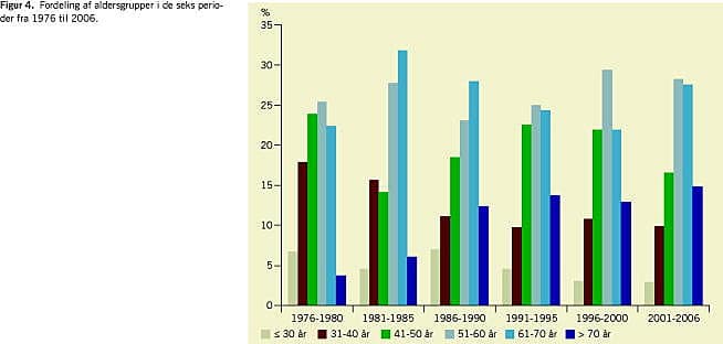 Den gennemsnitlige alder på diagnosetidspunktet var ca. 46 år i 1977. Siden er alder på diagnosetidspunktet steget langsomt, men støt til ca. 60 år i 2006 (Figur 2). Hvis man ser på fordelingen af aldersgrupper i de forskellige perioder (Figur 4 ) ses det, at aldersgrupperne på 40-70 år udgør en uændret andel af patienterne fra 1976 til 2006. Den stigende gennemsnitsalder stammer mest fra ydergrupperne. De yngste grupper udgjorde ca. 25% i begyndelsen af perioden og ca. 13% i slutningen af perioden. Samtidig er den ældste aldersgruppe over 70 år steget fra at udgøre 4% af patienterne i begyndelsen af perioden til 15% i slutningen af perioden (Figur 4).