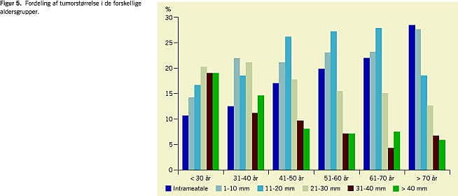 I den yngste aldersgruppe var den gennemsnitlige tumorstørrelse 26,6 mm mod 13,4 mm i aldersgruppen over 70 år. Hvis man ser på fordelingen af tumorstørrelse i de enkelte aldersgrupper, er det iøjnefaldende, at i den ældste aldersgruppe dominerer de intrameatale og små ekstrameatale, hvor der er lige omvendt i de yngste aldersgrupper hvor de store tumorer dominerer (Figur 5 ).