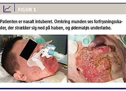 En 23-årig mand blev indlagt med forfrysningsskader i munden og svælget samt på armen og halsen (Figur 1). Skaderne opstod efter inhalation af propangas gennem en slange, der var tilsluttet en standard 11 kg-gasflaske. Flasken indeholdt hovedsageligt propan (flaskegas).