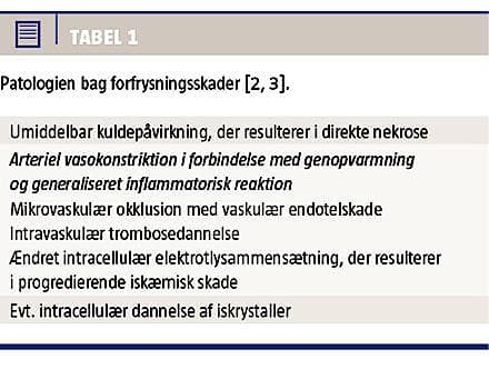 Den primære behandling ved forfrysningsskader, hvis patologi kan ses i Tabel 1, er at fjerne eksponeringen. Den kolde agens vil fortsat forværre skaden, indtil den fjernes fra området; alt forurenet tøj bør således fjernes, og huden bør forsigtigt afvaskes. Behandlingen er i øvrigt symptomatisk. Der er kendskab til enkelte lignende tilfælde [4, 5].