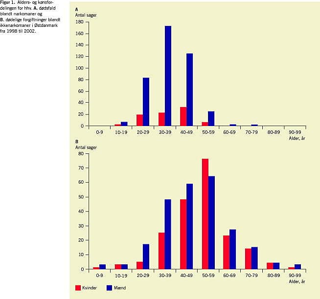 I perioden 1998-2002 blev der foretaget 4.073 retslægelige obduktioner i Østdanmark. Ved 2.996 obduktioner var der blevet anmodet om retskemisk undersøgelse, hvilket svarer til 74% af de retslægelige obduktioner. Blandt de 2.996 obducerede var 694 narkomaner, heraf var 497 dødeligt forgiftede, hvilket svarer til 72% af dødsfaldene blandt narkomaner. Hos de øvrige 2.302 ikkenarkomaner blev der påvist 443 dødelige forgiftninger, hvilket udgør 19%. De enkelte andele kan have været højere, bl.a. fordi der i enkelte obduktioner ikke var rekvireret alle rutineanalyser, hvilket medførte en ufuldstændig retskemisk undersøgelse.