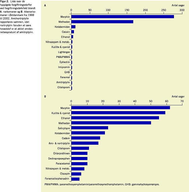De 15 hyppigste forgiftningsstoffer blandt narkomaner ses i Figur 2A . Dødelige forgiftninger skyldtes en overdosis med morphin (heroin) i 56% af tilfældene og med methadon i 34% af tilfældene. Disse to stoffer var således dødsårsagen i 90% af de dødelige forgiftninger blandt narkomanerne. Det skal bemærkes, at det normalt kun er morphin, som bestemmes, pga. heroins hurtige omdannelse i organismen til morphin. Det tredje- og fjerdehyppigste stof var hhv. ketobemidon og cocain, som tilsammen var årsag til 3% af tilfældene. Derefter fandtes hhv. ethanol og nitrazepam, og resten var enkeltstående tilfælde.