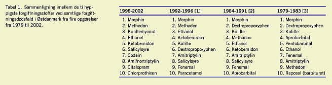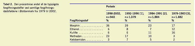 En sammenligning af denne periodes (1998-2002) resultater med tidligere opgørelser er vist i Tabel 1 , hvor de ti hyppigste forgiftningsstoffer for undersøgelsesperioder i hhv. 1992-1996 [1], 1984-1991 [2] og 1979-1983 [3] ses. I Tabel 2 ses de procentvise andele for hver periode af de fem hyppigste forgiftningsstoffer blandt samtlige dødelige forgiftninger. Antallet af dødelige forgiftninger var faldet fra omkring 336 pr. år i første periode til 236, derefter 216 og i indeværende periode 188 forgiftninger årligt. Morphin var det hyppigste stof i alle perioderne. For tre af stofferne: morphin, ethanol og ketobemidon var andelen faldet siden sidste opgørelse, førstnævnte havde ellers hidtil været stigende, mens andelen af kulilte/cyanid var stagneret efter at havde været jævnt faldende over perioderne, men det var oftest den tredjehyppigste dødsårsag. Andelen af akutte ethanolforgiftninger var lavere i denne undersøgelse end forventet sammenholdt med en offentliggørelse fra Sundhedsstyrelsen på baggrund af oplysning fra Landspatientregisteret om, at hver femte person dør af alkohol. Det kan skyldtes nærværende materiales begrænsning, bl.a. at der kun er inkluderet akutte ethanolforgiftninger. Methadon var det hyppigste forgiftningsstof efter morphin (heroin), og andelen steg fra 3% i 1979-1983 til 23% i nærværende undersøgelse.