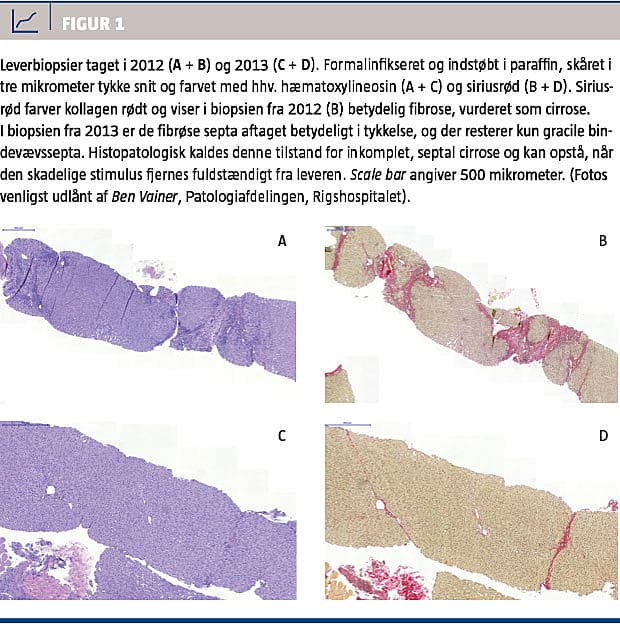 Elleve år senere sås pigen af en hudlæge efter henvisning til laserbehandling af spider-naevi. ALAT-niveauet var da på 1.200 E/l, og hun blev henvist til en børneafdeling, hvor man planlagde kontrolblodprøver og ultralydskanning af abdomen en måned senere. Pigen blev herefter henvist til Hepatologisk Afdeling på Rigshospitalet, hvor hun blev indlagt. ALAT-niveauet blev målt til 1.100 E/l , IgG-niveauet til 28 g/l (referenceværdi: 7,4-15,6 g/l) og koagulationsfaktor II-VII-X 0,41 (> 0,60 arbitrære enheder/l). Pigen havde cirrose stigmata med ultralydverificeret ekkotæt lever, splenomegali og retvendt flow i vena portae med lav flowhastighed (15 cm/s). En planlagt leverbiopsi næste dag måtte aflyses pga. faldende koagulationsfaktor. På mistanke om autoimmun hepatitis (forhøjet IgG-niveau og tidligere svagt positiv glatmuskelcelleantistofniveau) påbegyndte man behandling med prednisolon 40 mg dagligt. Tolv dage senere var ALAT-niveauet på 229 E/l, og hun blev udskrevet. En leverbiopsi taget tre måneder senere viste cirrose og kronisk aktiv hepatitis (Figur 1). Efter 11 måneders behandling havde hun normal koagulationsfaktor II-VII-X 0,61, ALAT-niveau på 58 E/l og IgG-niveau på 9,1 g/l. Hun blev derefter behandlet med 10 mg prednisolon og 125 mg azathioprin dagligt.