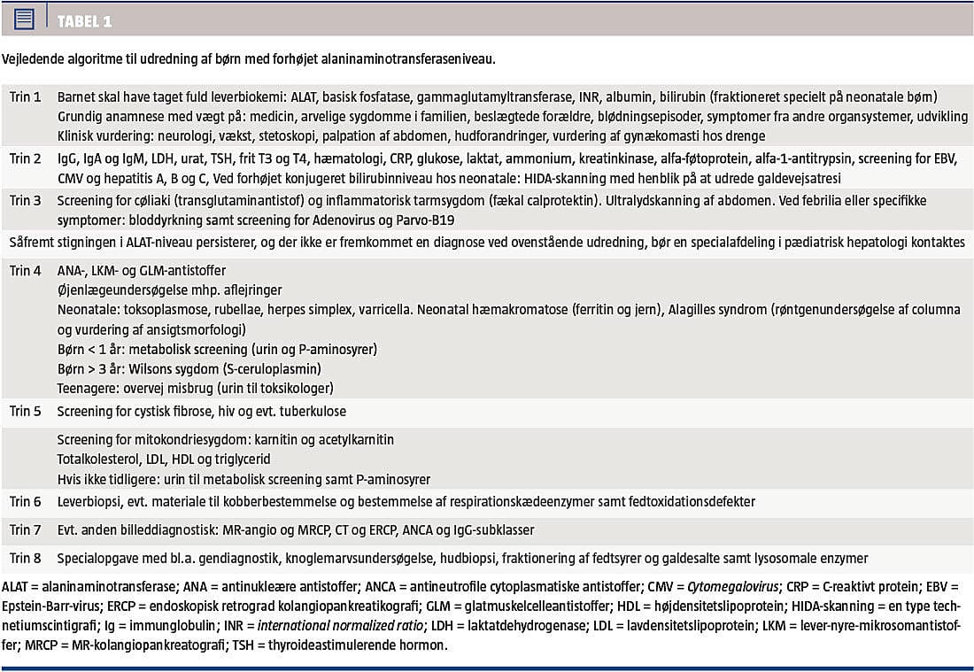 Sygehistorien illustrerer, hvor betydningsfuld en tilbundsgående undersøgelse af børn med stigning i ALAT-niveauet er, således at risikoen for cirroseudvikling og evt. levertransplantation begrænses mest muligt. Det er usikkert, hvor mange raske børn der har intermitterende forhøjelse af ALAT-niveauet uden klinisk betydning. I en nyligt publiceret dansk undersøgelse af børn og unge med autoimmun hepatitis havde 75% cirrose på debuttidspunktet [1], hvilket tyder på længere tids sygdom. Hos voksne er det påvist, at korrekt behandling af autoimmun sygdom kan nedsætte graden af fibrose fundet ved leverbiopsi [2]. Stigning i ALAT-niveauet i barnealderen kan derfor have stor betydning og bør udredes hos alle børn og unge. Der er ikke evidensbaserede undersøgelser, hvor man har fulgt børn med påvist stigning i ALAT-niveauet. Vores anbefaling bygger på en algoritme, som vi har fundet klinisk brugbar (Tabel 1).