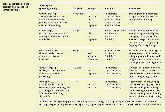 Den bedste måde at undersøge forholdet mellem spontan bedring og egentlig placebovirkning på er naturligvis kontrollerede studier med såvel placebo- som kontrolgrupper uden behandling. Hrobjartsson & Gøtzsche [1] fandt fem undersøgelser af depression med såvel placebokontrol som ingen behandling [8-12] i deres litteratursøgning indtil 1998. I en opdateret søgning (11. juli 2004) med de samme søgeord kombineret med depression i PubMed og PsycINFO blev der ikke fundet nyere undersøgelser (Tabel 1 ).