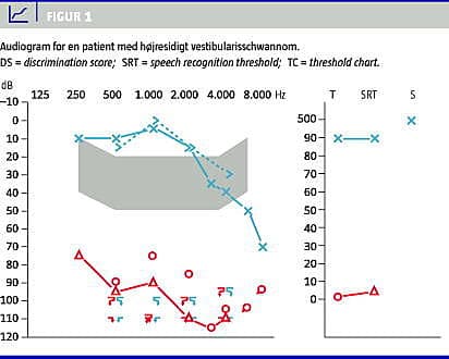 Patienten fik i 1994 pludselig hørenedsættelse og tinnitus på højre side. Udredning på en audiologisk afdeling viste højresidigt perceptivt høretab med maskeret skelneevne (discrimination score (DS)) på 92%. På mistanke om vestibularisschwannom [1] blev patienten udredt med magnetisk resonans (MR)-skanning af n. acusticovestibularis, som blev fundet normal. Han blev behandlet med høreapparat på højre øre.