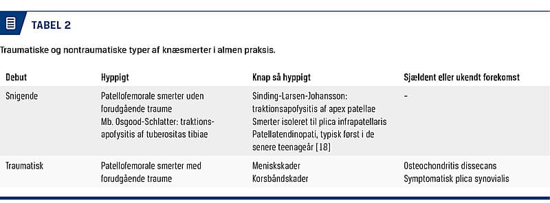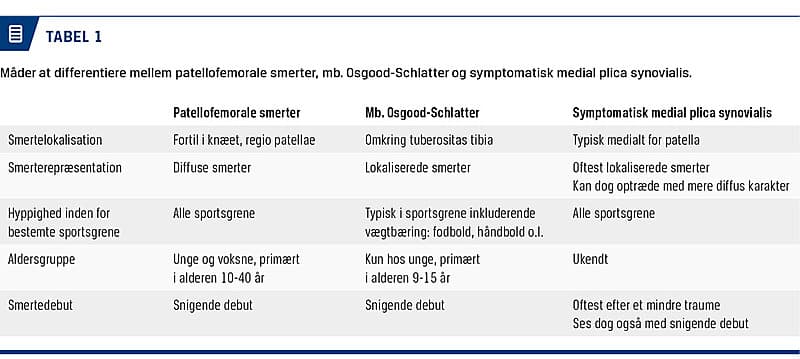 Patellofemorale smerter er defineret som smerter på forsiden af knæet, oftest af diffus karakter. Smerterne skal være til stede under aktiviteter, som belaster det patellofemorale led såsom hop, benbøjning, løb og trappegang [2, 3]. Diagnosen patellofemorale smerter anvendes, efter at man har udelukket refererede smerter fra hoften og andre typer knæsmerter med lignende symptomer (morbus Osgood-Schlatter, symptomatisk plica synovialis) [12]. I Tabel 1 beskrives, hvordan patellofemorale smerter, morbus Osgood-Schlatter og symptomatisk medial plica synovialis kan differentieres fra hinanden. Unge med morbus Osgood-Schlatter vil typisk have smerter under de samme aktiviteter som unge med patellofemorale smerter (knæbelastende aktiviteter såsom hop og løb). Hos unge med morbus Osgood-Schlatter vil smerterne dog ofte være velafgrænsede i området omkring tuberostias tibia [13].