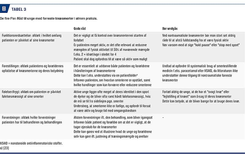 Uanset diagnosen bør den initiale behandling af unge med nontraumatiske knæsmerter som minimum omfatte information og patientuddannelse [9]. Hos de unge, som er meget sportsaktive, bør fokus være på justering af træningsmængden, og der kan eventuelt udleveres nogle simple øvelser og dernæst råd om, hvordan de unge kan vende tilbage til sport [22]. I Tabel 3 findes konkrete eksempler på, hvilke elementer klinikerne kan inkorporere i konsultationen med de unge og deres forældre, samt hvad det frarådes at inddrage. Målet er at give de unge og deres forældre redskaberne til at forestå egenhåndteringen af de unges knæsmerter og hjælpe dem med at tage ejerskab til behandlingsforløbet [22]. Det forventes, at fire ud af fem unge med patellofemorale smerter responderer positivt på patientuddannelse, justering af træningsmængden og simple hjemmeøvelser [22].