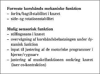 Den maksimale trækstyrke af forreste korsbånd er ca. 2000 N (ca. 200 kg), og den kan formentlig ikke øges ved træning (4). Hvis korsbåndet udsættes for kraftigere træk, brister det (Boks 1).