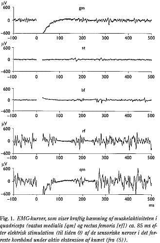 Ved stimulation af de sensoriske nerver i korsbåndene kan der udløses en muskulær refleks. I hvile udløses en kontraktion i hasemuskulaturen, mens refleksen under muskelaktivitet er hæmmende, dvs. standser den igangværende aktivitet (5). Refleksen har for lang en latenstid til at kunne beskytte korsbåndet mod en akut belastning, og dens funktion er formentlig primært at opdatere de motorprogrammer, som koordinerer knæets bevægelser (5) (Fig. 1).
