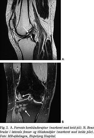 Artroskopisk synlige bruskskader ses hos ca. 10%, men ved MR-scanning kan der hos over 50% påvises et kraftigt knogleødem (bone bruise) i den laterale femurkondyl i månederne efter en korsbåndsskade (Fig. 2), og biopsier tyder på, at forandringerne når helt ned i brusken. Det vides ikke, om bone bruise disponerer for slidgigt, men det kan være årsagen til, at nogle patienter har meget ondt, når de støtter på knæet i månederne efter en korsbåndsskade.