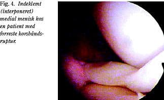 Den akutte behandling af kombinerede skader er i modsætning hertil ofte kirurgisk. Ved en indeklemt menisklæsion med aflåsning bør menisken reponeres subakut og om muligt reinsereres (Fig. 4). Flerligamentskader bør vurderes af en ortopædkirurg i den akutte fase (dvs. inden for nogle dage), og nogle af disse skader - især i det posterolaterale hjørne af knæet - bør opereres med sutur af de beskadigede suturer og rekonstruktion af korsbåndet, idet akut behandling synes at være mere succesfyldt end senere rekonstruktion (13).
