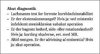 Derfor bør der altid tages røntgen ved mistanke om akut forreste korsbåndsskade. Ved klinisk mistanke om samtidig ruptur af det bageste korsbånd eller det posterolaterale hjørne kan subakut MR-scanning være indiceret som led i planlægningen af operativ behandling i den akutte fase.