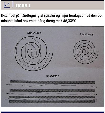 Det interessante ved denne sygehistorie var den neurologisk undersøgelse. Det var den posturale og kinetiske tremor, milde dysartri og dysdiadokinese kombineret med en forsinket psykomotisk udvikling, stor højde og let eleveret FSH, der gav anledning til en kromosomanalyse. Tremor kan nemlig være associeret med kønskromosom aneuploidy [2, 5], og i et studie med 95 patienter med 48,XXYY er det angivet, at den kinetiske tremor er til stede hos 8% før tiårsalderen, hos 62% i alderen 11-20 år og hos 71% af de voksne patienter [2].