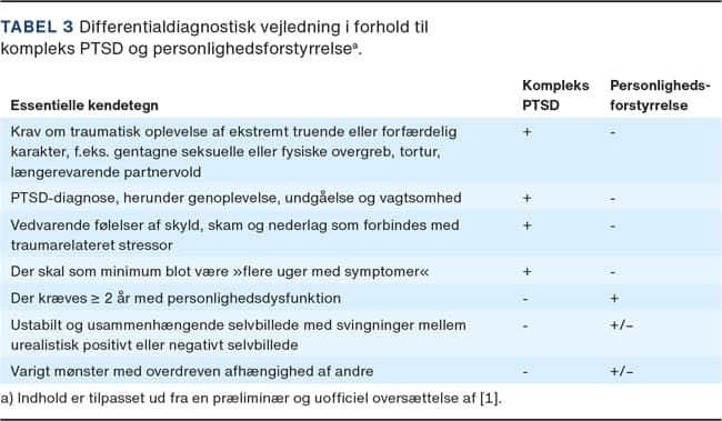 Med ICD-11 får vi mulighed for at stille diagnosen kompleks PTSD, hvilket inkluderer både klassiske PTSD-symptomer samt vedvarende forstyrrelser i personlighedsfunktionen [1-7]. Denne diagnose erstatter ICD-10-diagnosen F62.0 Personlighedsændring af katastrofeoplevelse. Grundet store konceptuelle og empiriske overlap har man ofte sammenlignet kompleks PTSD med personlighedsforstyrrelse, herunder typisk borderline og ængstelig-evasiv type [5, 8, 9]. Der har sågar været argumenteret for, at ICD-11-diagnosen kompleks PTSD overflødiggør diagnosen borderline personlighedsforstyrrelse [10], mens andre har søgt at fremhæve forskellene mellem disse diagnoser [11, 12]. Tilsvarende er der fremhævet ligheder imellem kompleks PTSD og undvigende personlighedsforstyrrelse, med vægt på undgåelsesadfærd [13].