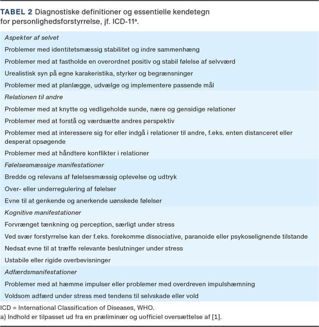 Som det fremgår af Tabel 2 er ICD-11-diagnosen for personlighedsforstyrrelse baseret på en generel vurdering af dysfunktion i aspekter af selvet og relationen til andre samt emotionelle, kognitive og adfærdsmæssige manifestationer heraf. Den globale sværhedsgrad af forstyrrelsen klassificeres som enten »let«, »moderat« eller »svær«. Herudover har klinikeren mulighed for at anvende tillægskoder, såkaldte »specifiers«, som ikke er diagnoser, men udfolder nuancerne af den diagnosticerede personlighedsforstyrrelse: negativ affektivitet, tilbagetrækning, dyssocialitet, mangelfuld hæmning og anankasme. Efter at sværhedsgrad er diagnosticeret og personlighedstræk er beskrevet, har klinikeren yderligere mulighed for at specificere, om det samlede billede ligner det velkendte borderlinemønster [1, 14, 18].