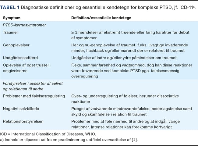 Som det fremgår af Tabel 1, tager kompleks PTSD-diagnosen udgangspunkt i klassiske PTSD-symptomer, som suppleres med symptomer på specifikke forstyrrelser i personlighedsfunktionen [1, 7, 17]. Sidstnævnte indbefatter emotionel dysregulering, negativt selvbillede med vedvarende skyld og skam samt vanskeligheder med at fastholde relationer og at føle nærhed til andre.